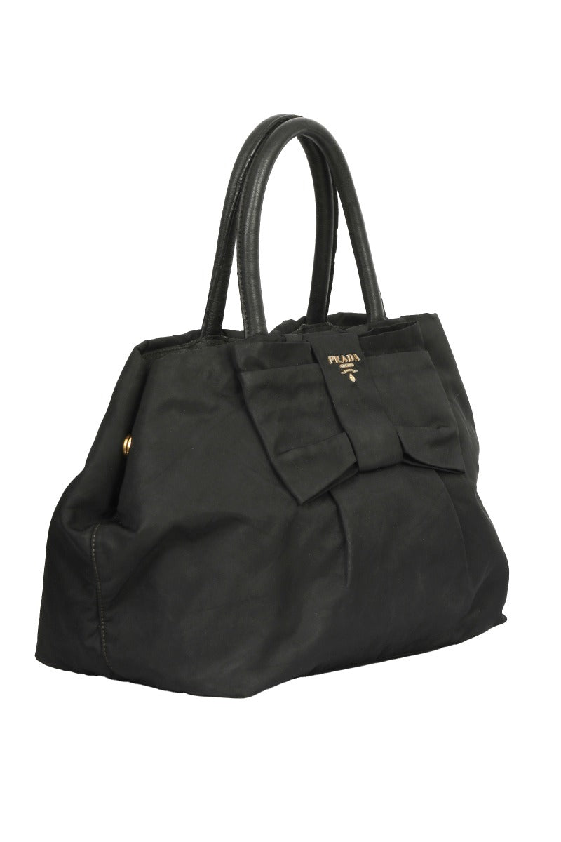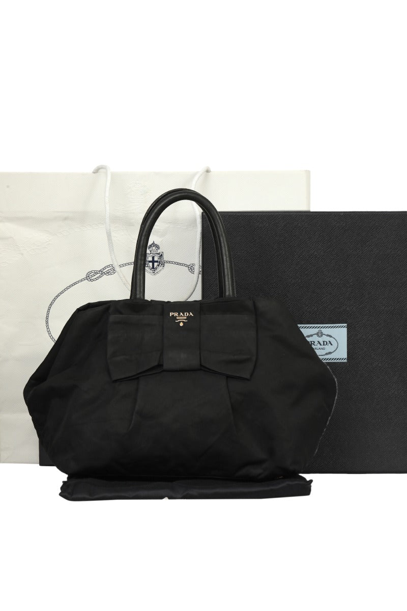 Prada Nylon Black Bow Top Handle Bag comes in this Stunning BLACK color. It falls under our PRISTINE Condition Category. No visible wear and tear or fading can be seen.