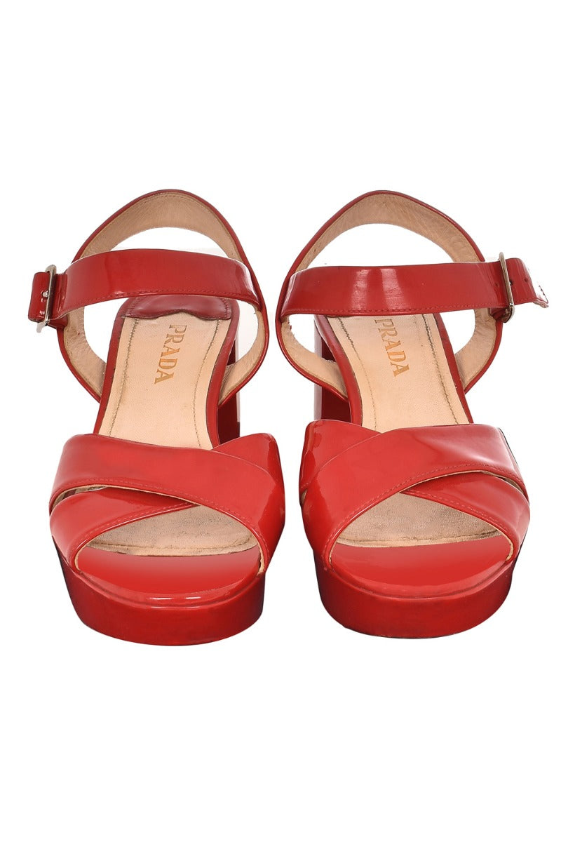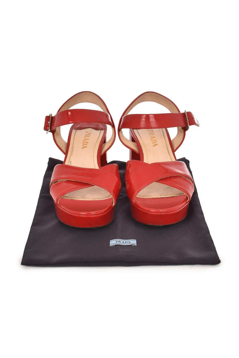 PRADA PLATFORM ANKLE WRAP SANDALS Comes in this stunning Red color. It falls under our Pristine Condition Category. No visible wear and tear or fading can be seen