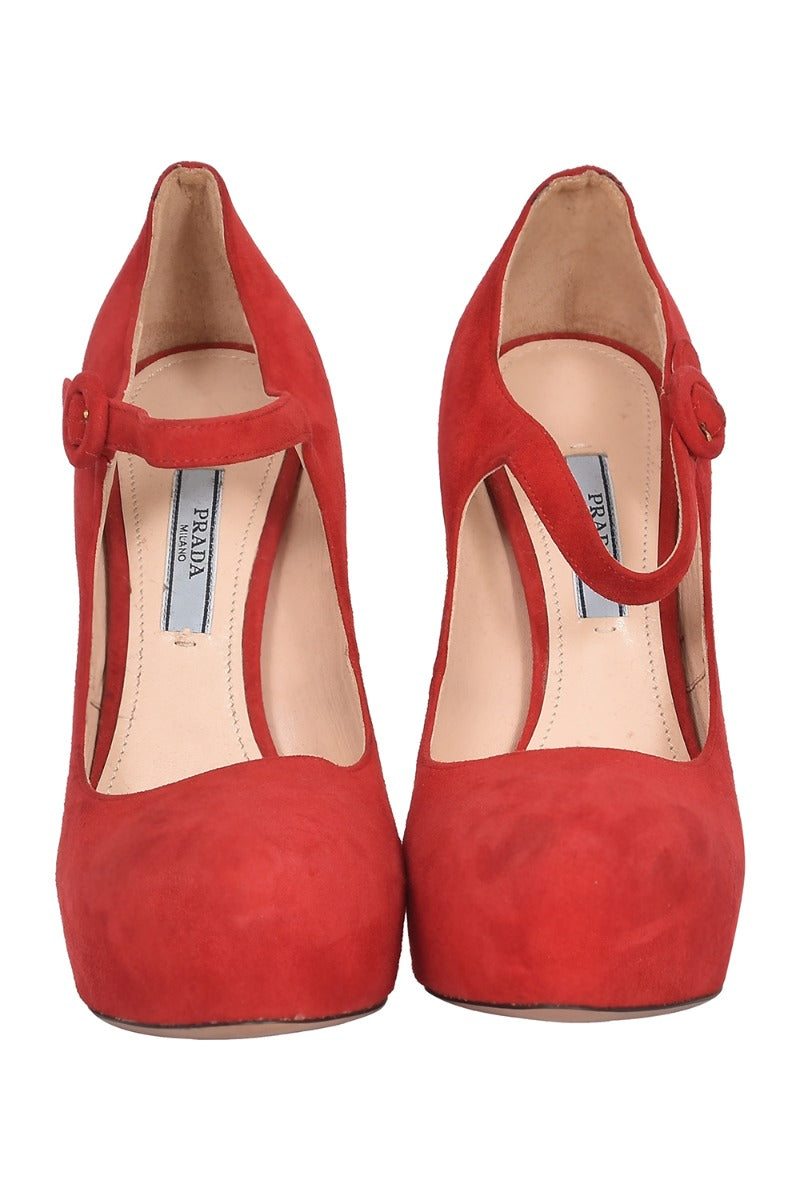 Prada Suede Mary Jane Platform Red Pumps comes in this stunning Red color. It falls under our New Without Tags Condition Category. No visible wear and tear or fading can be seen