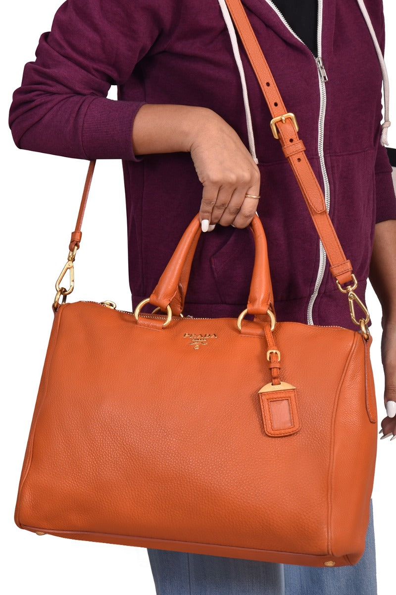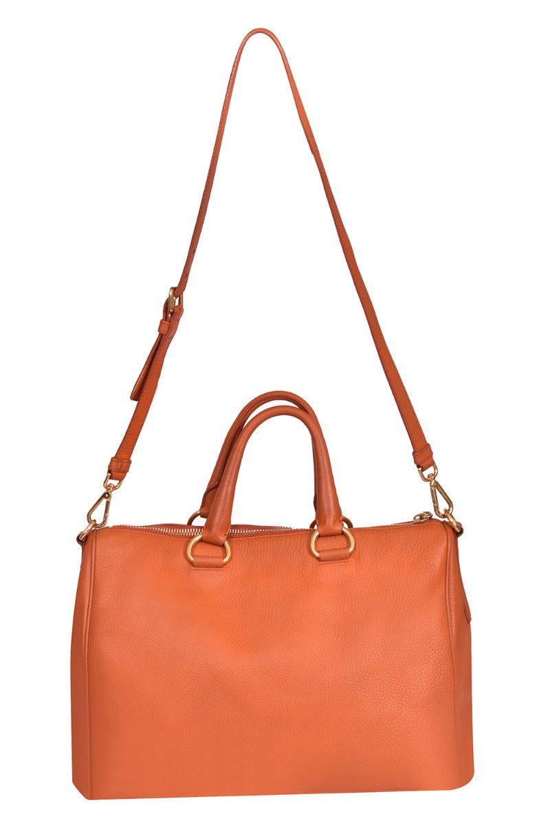 Prada Vitello Daino Satchel Bag comes in this Stunning Orange color .It falls under our Pristine Condition Category. No visible wear and tear or fading can be seen