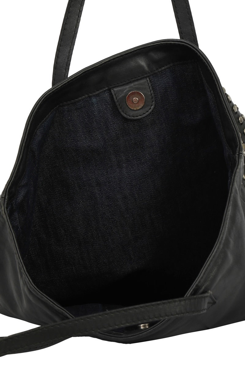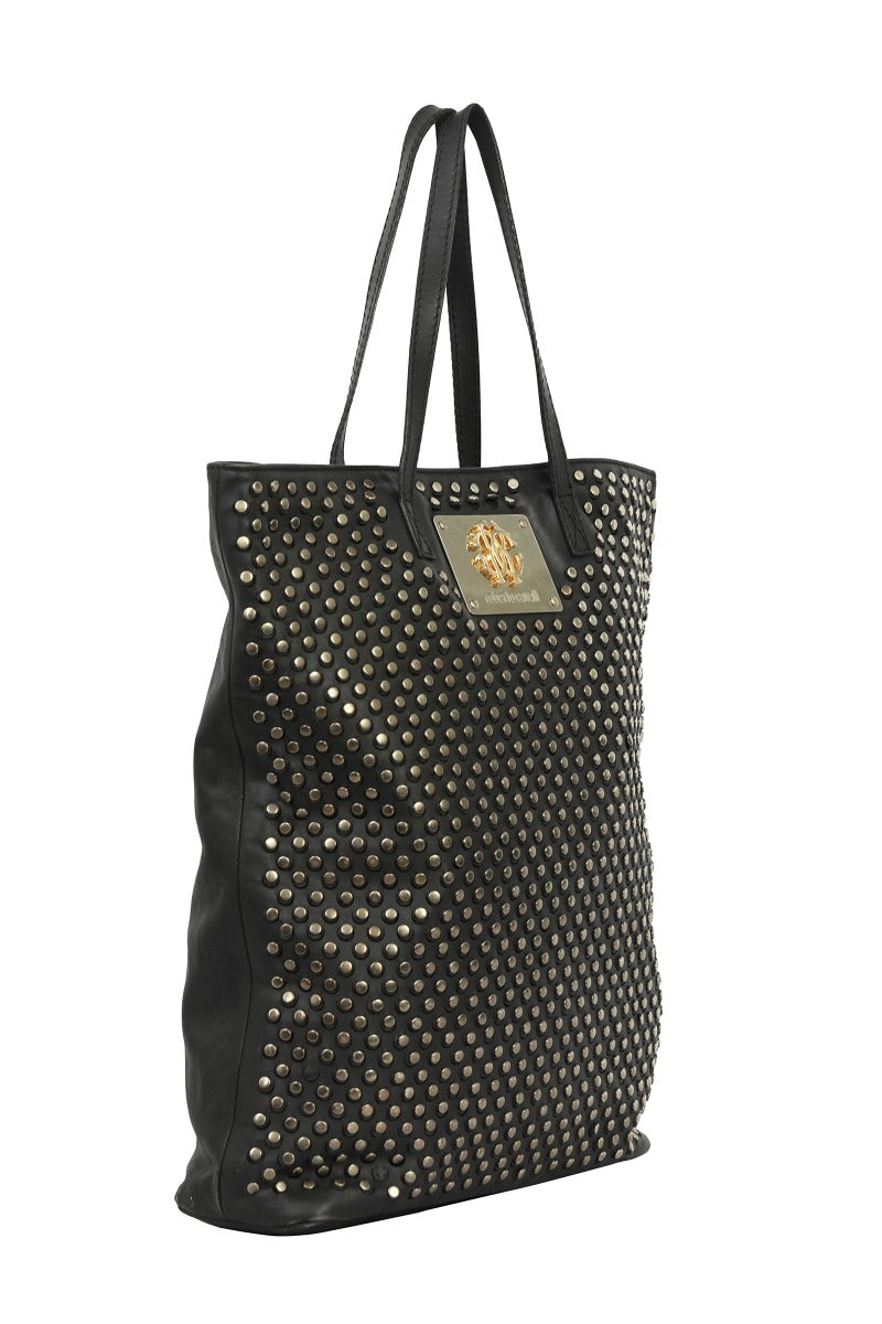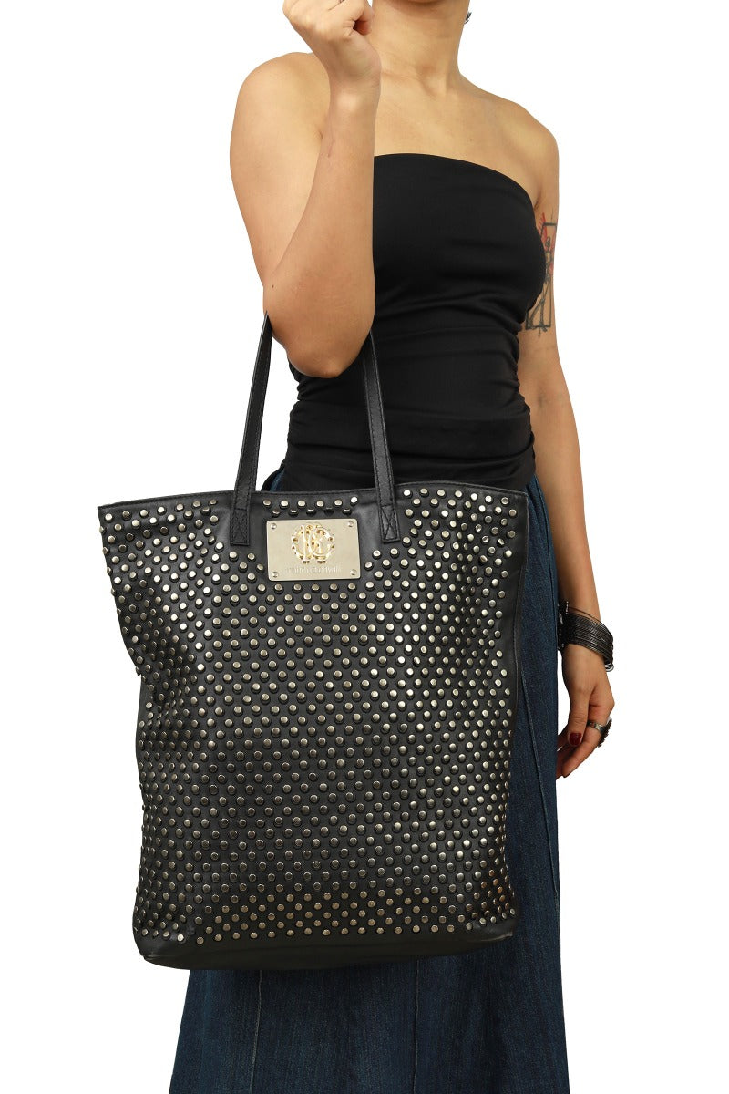Roberto Cavalli Black leather Studded Long Tote Bag comes in this Stunning Black color. It falls under our LIKE NEW Condition Category. No visible wear and tear or fading can be seen.