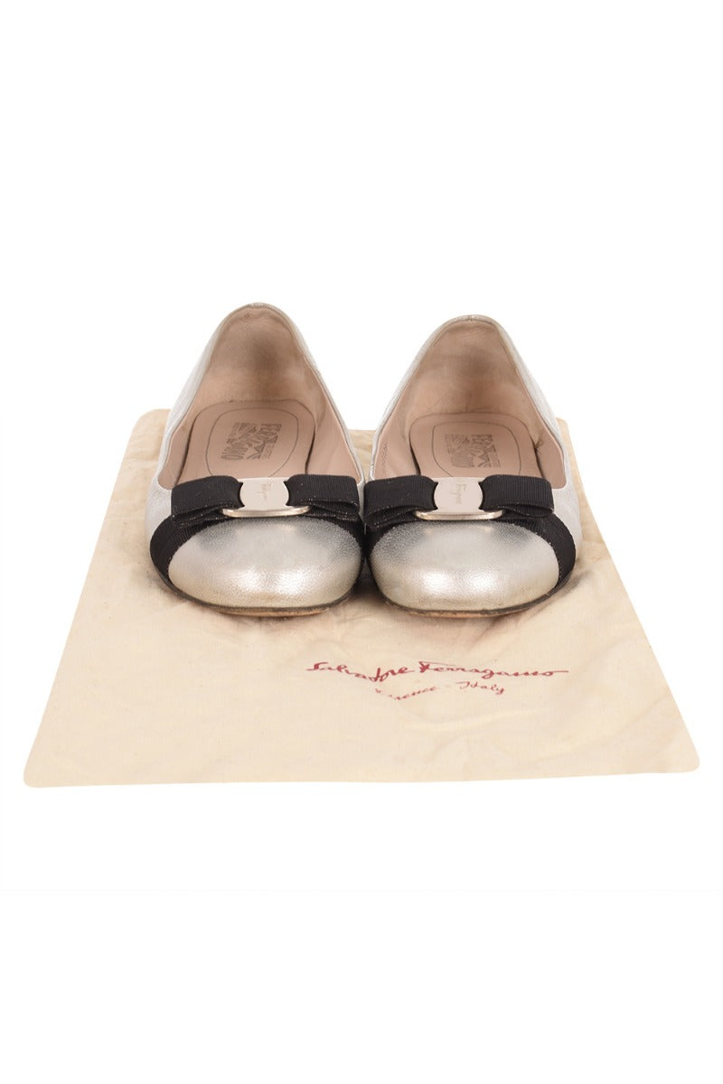SALVATORE FERRAGAMO BALLET FLATS comes in this stunning Silver color. It falls under our Pristine Condition Category. No visible wear and tear or fading can be seen