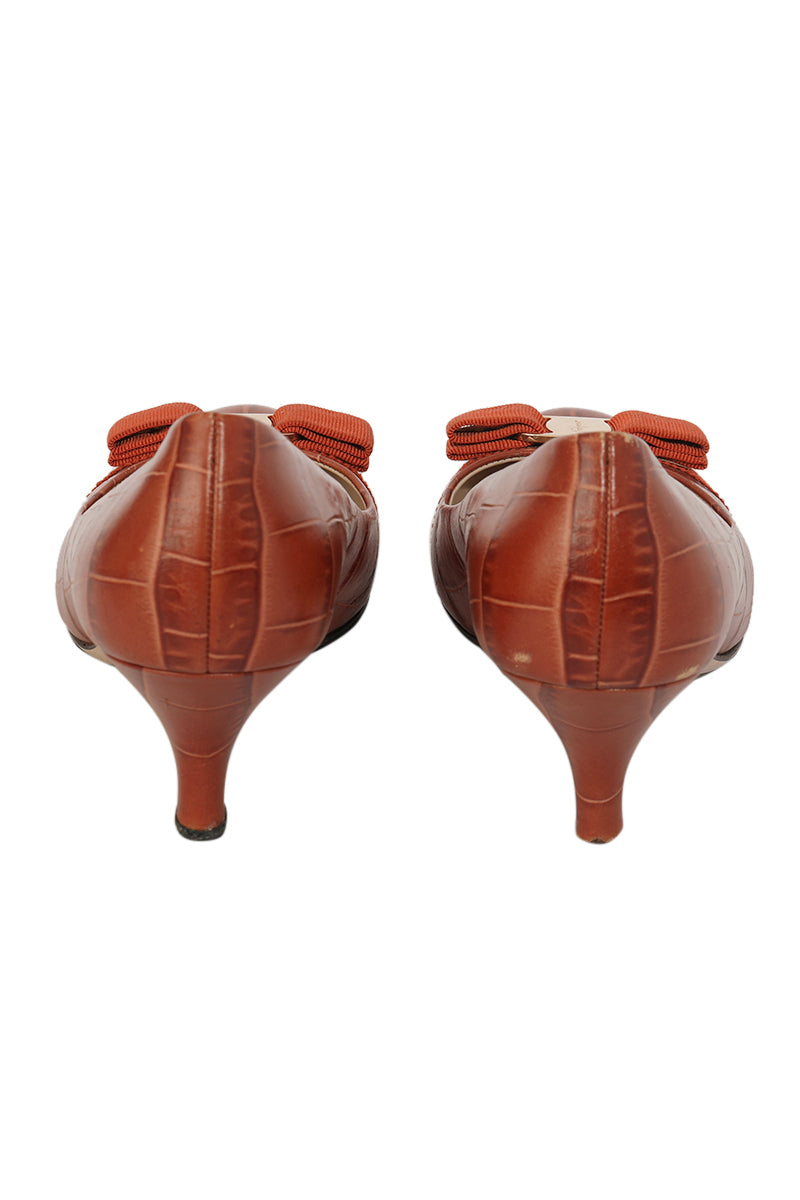 Salvatore Ferragamo Embossed Croc Leather Pumpscomes in this stunning Orange color. It falls under our Never been Used Condition Category. No visible wear and tear or fading can be seen