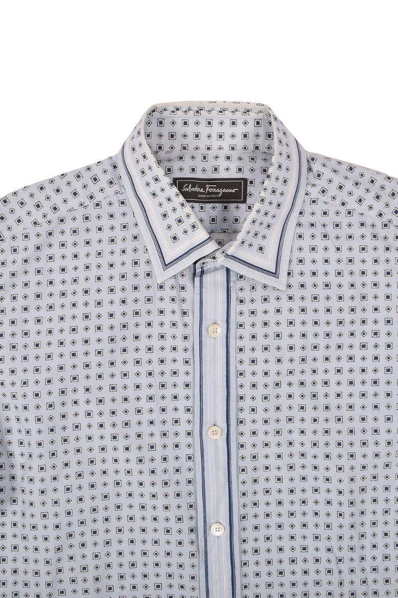 SALVATORE FERRAGAMO PRINTED SHIRT comes in this Stunning Sky Blue color. It falls under our Pristine Condition Category. No visible wear and tear or fading can be seen.