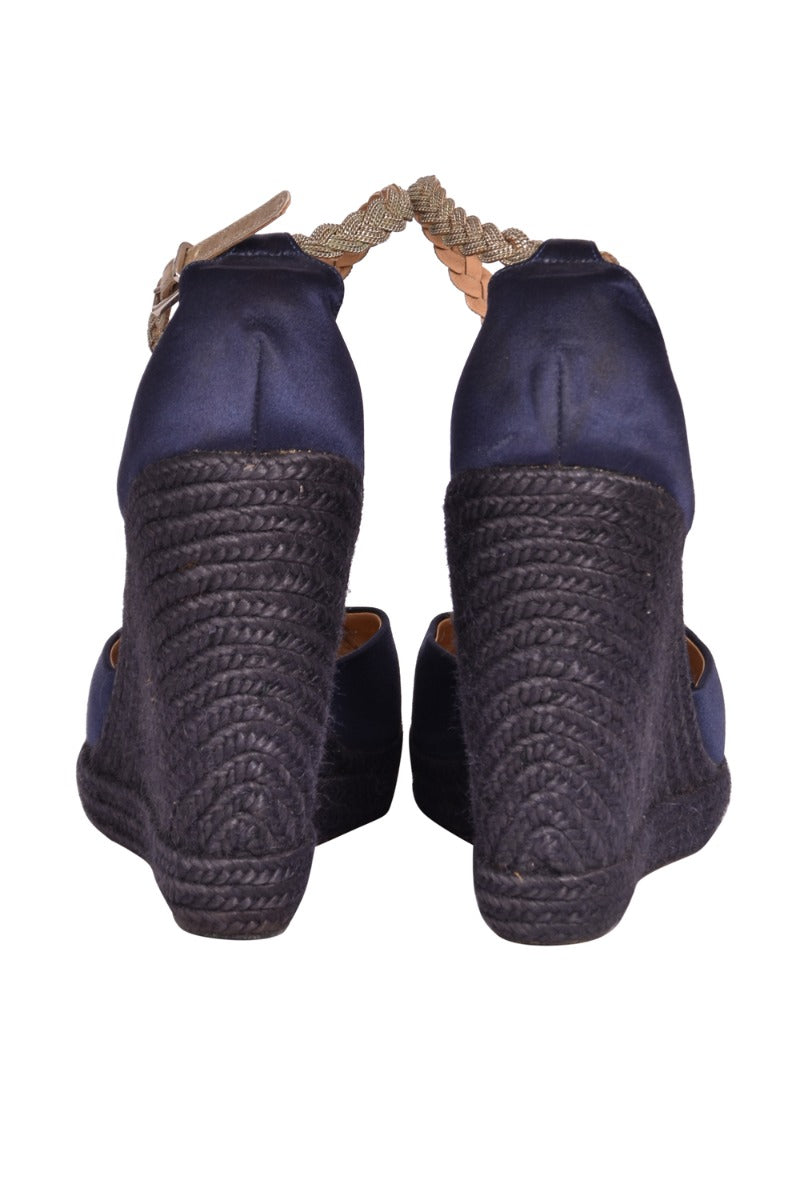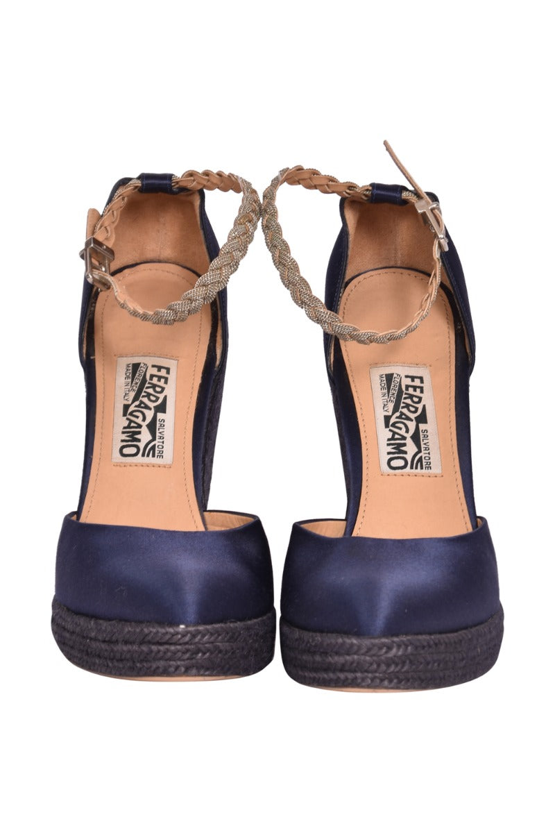 Salvatore Ferragamo Satin Espadrille Wedges comes in this stunning Dark Blue color. It falls under our Like New Condition Category. No visible wear and tear or fading can be seen.