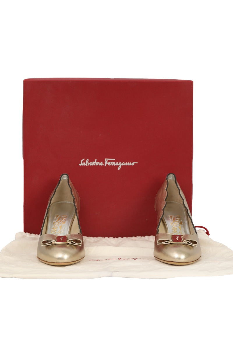 SALVATORE FERRAGAMO SIZE 9 CARLA SHELL VARA ORNAMENT PUMPS comesin this stunning Golden color. It falls under our New with tags Condition Category. No visible wear and tear or fading can be seen.