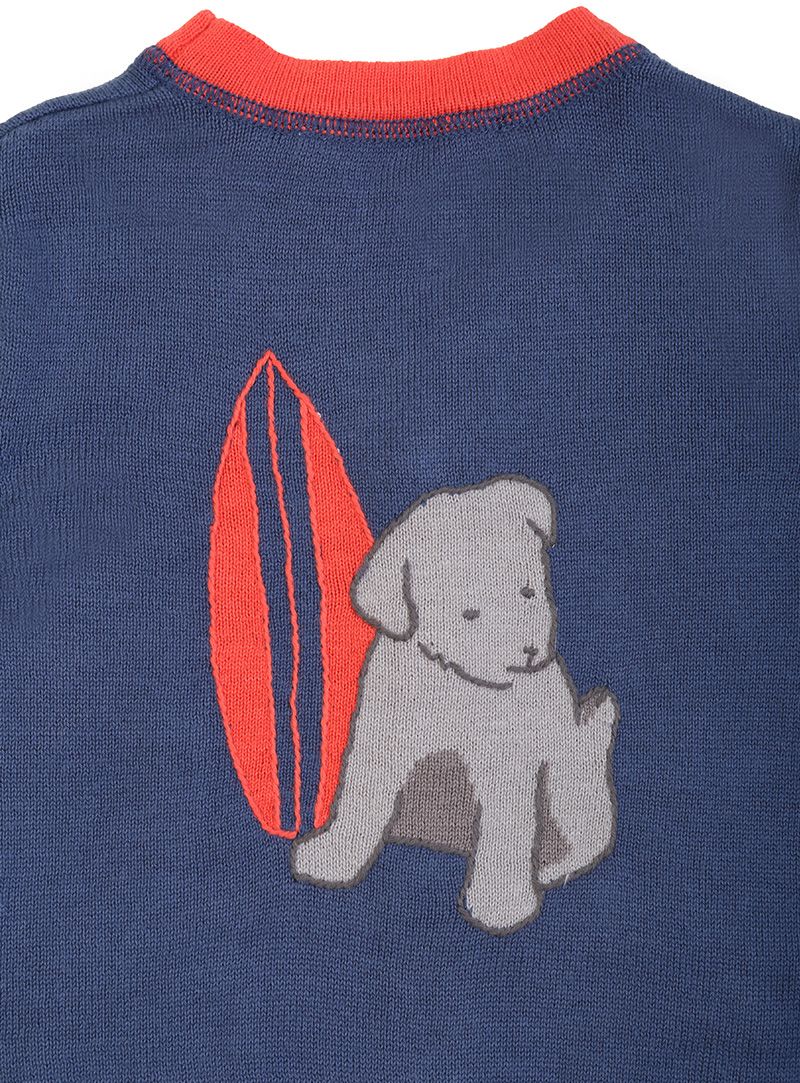 A Fine knit V- neck cardigan from the famous French brand Tartine et Chocolat. This playful cardigan comes with a puppy print at the back. Long sleeves, Logo buttons, Embroidered monogram on the bottom.