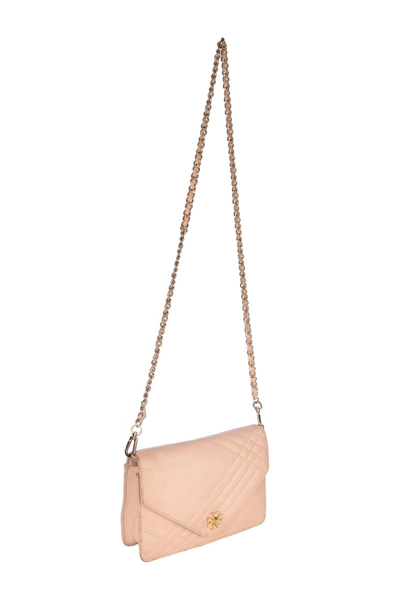 TORY BURCH KIRA CHEVRON CROSSBODY BAG comes in this Stunning Peach color .It falls under our Pristine Condition Category. No visible wear and tear or fading can be seen.