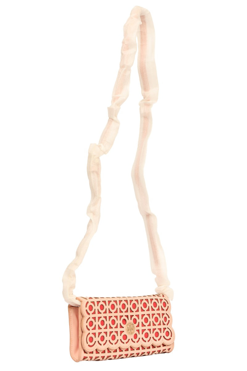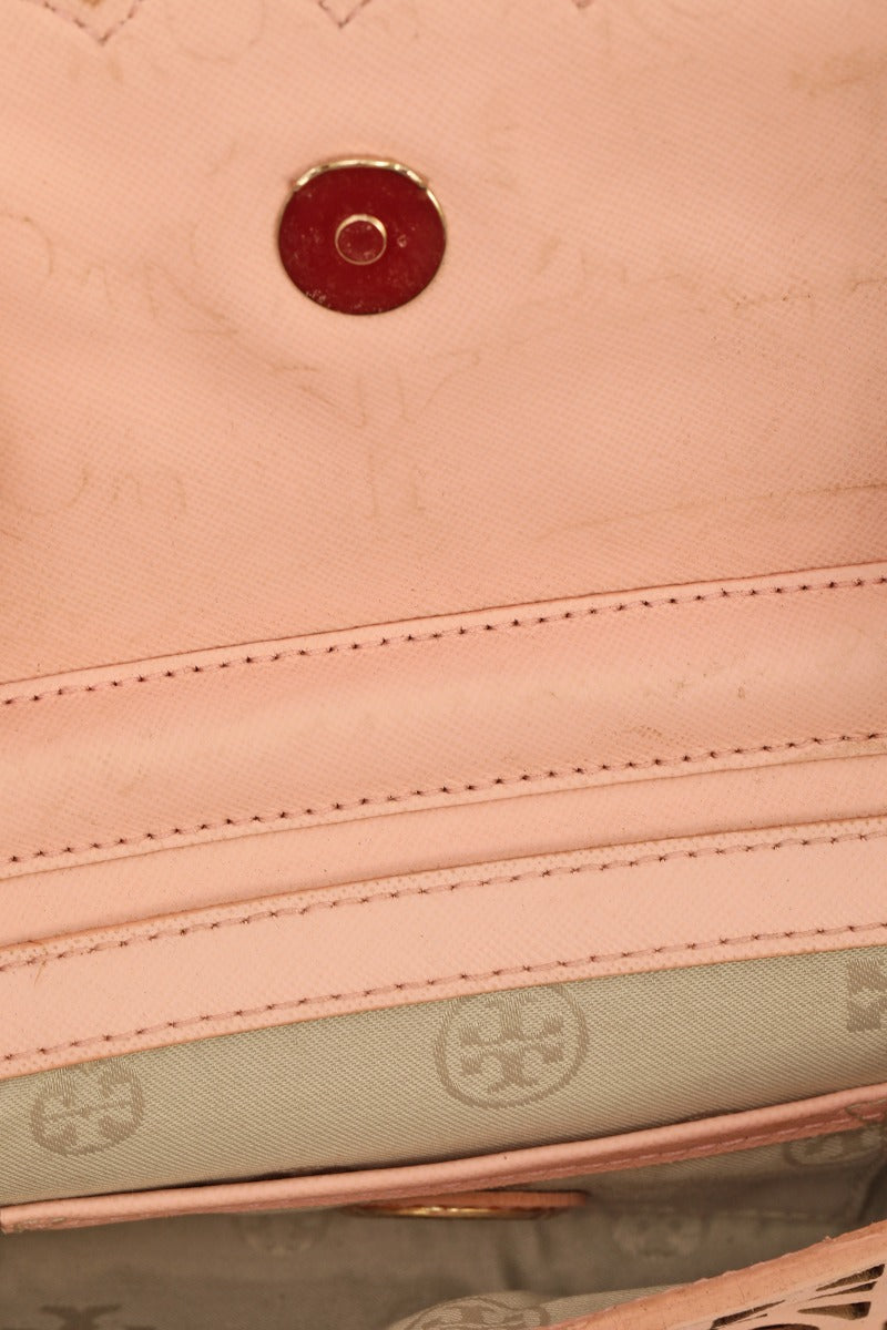 Tory Burch Peach Perforated Sling Bag comes in this Stunning Red color .It falls under our Like New Condition Category. No visible wear and tear or fading can be seen