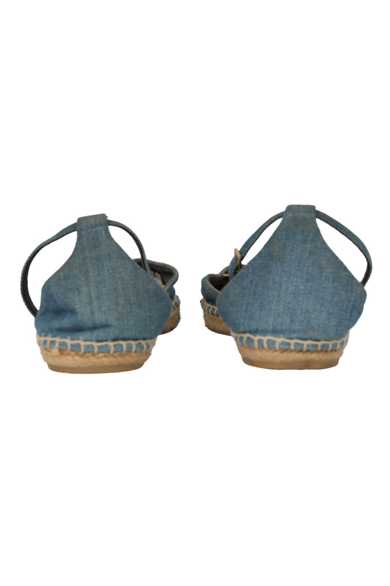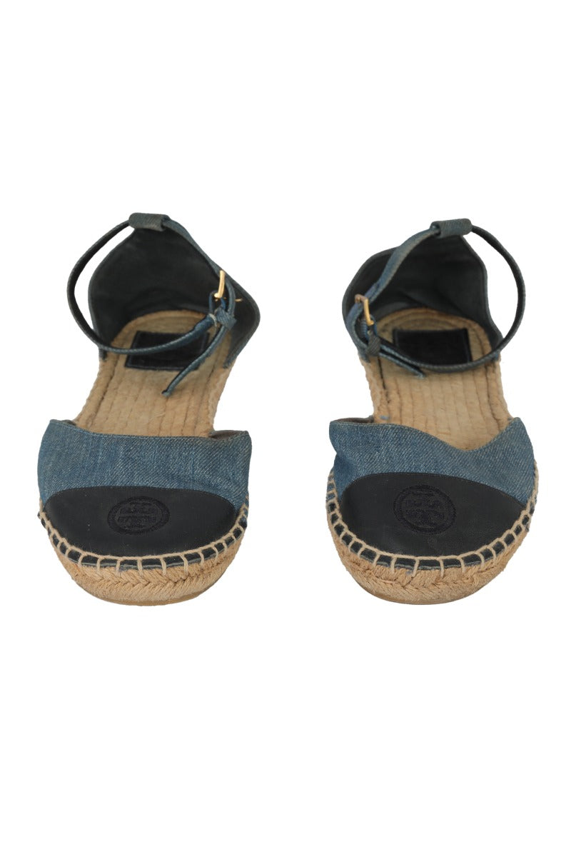 TORY BURCH SIZE 8 COLOR BLOCK DENIM ANKLE STRAP ESPADRILLES comes in this stunning Dark Blue color. It falls under our Pristine Condition Category. No visible wear and tear or fading can be seen.
