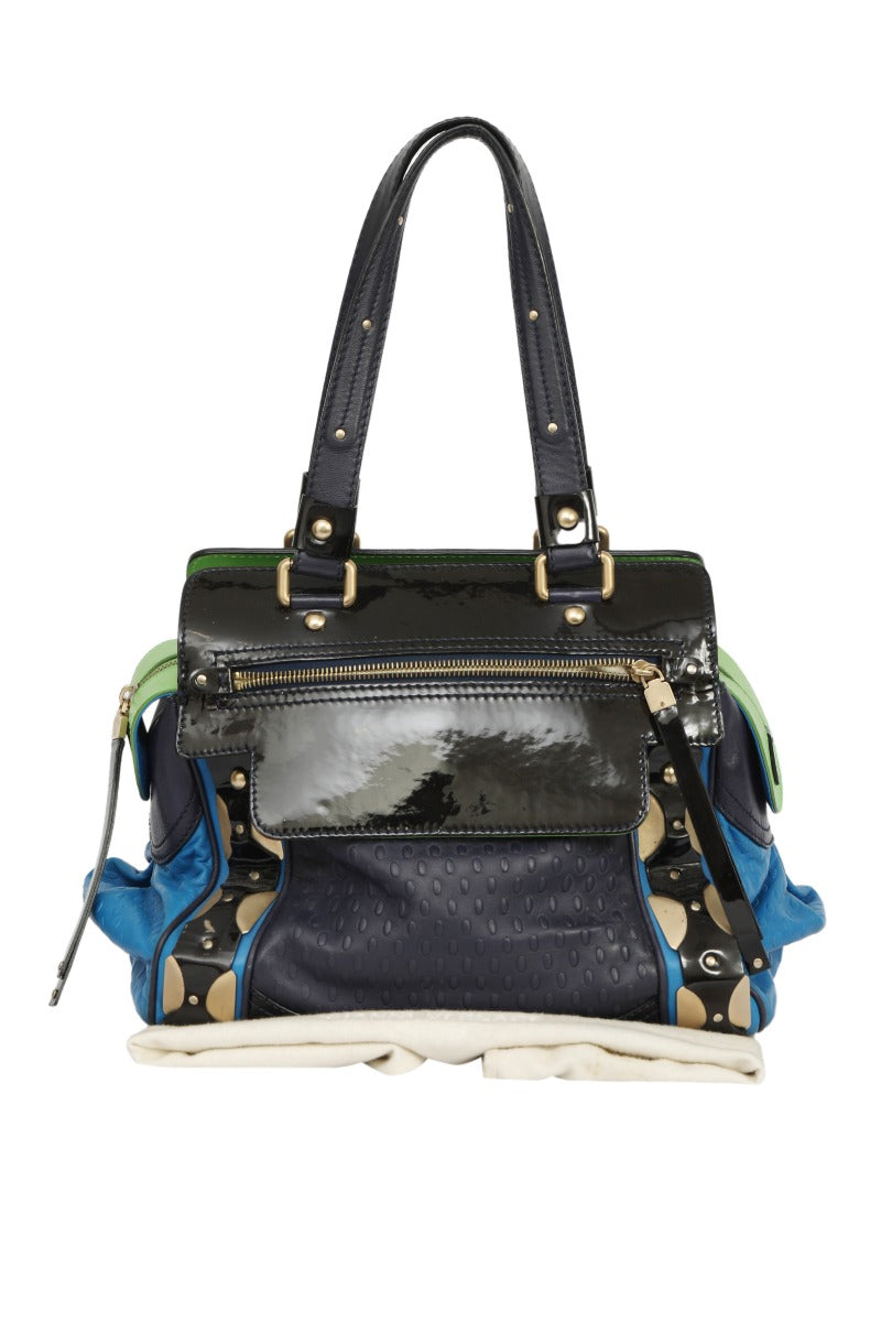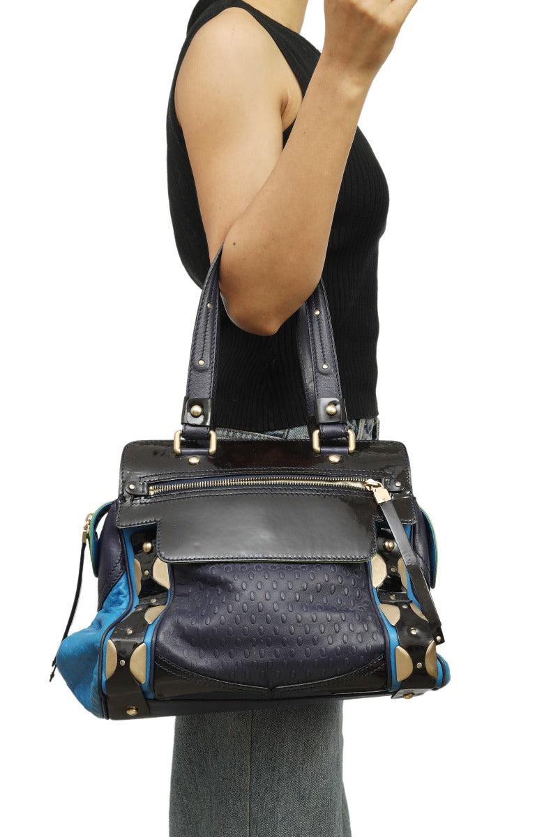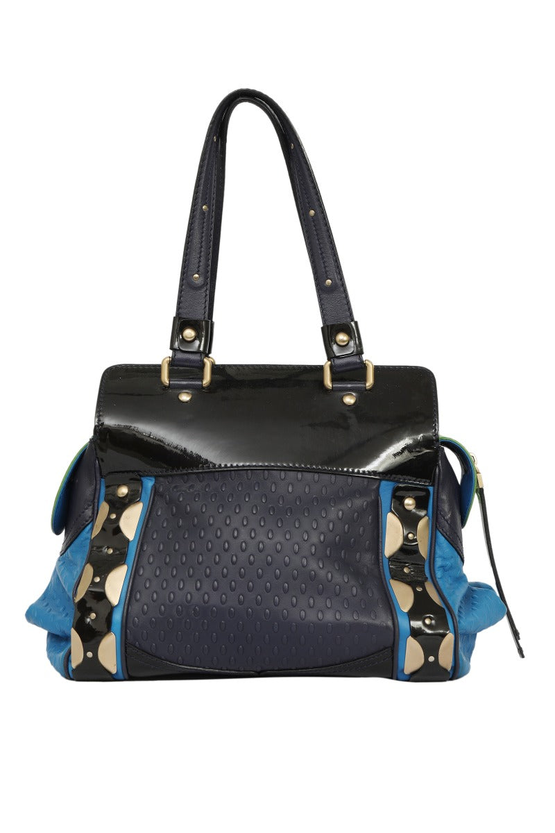 Versace Daria Studded Satchel Bag comes in this Stunning BLUE color .It falls under our PRISTINE Category. No visible wear and tear or fading can be seen