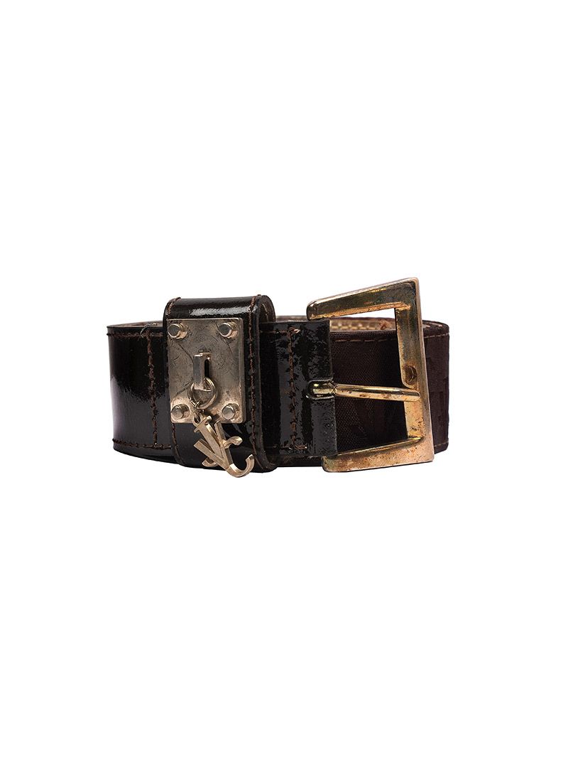 VJC MONOGRAM LEATHER BELT comes in this Stunning brown color with bronze rugged look hardware. This belt falls in a USED FAIRLY WELL Category. Few visible signs of wear & tear or fading can be seen on the leather or the buckle.