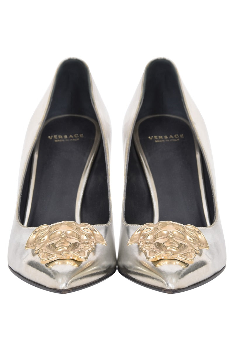 Versace Medusa Silver Pumps comes in this stunning Silver color. It falls under our Pristine Condition Category. No visible wear and tear or fading can be seen