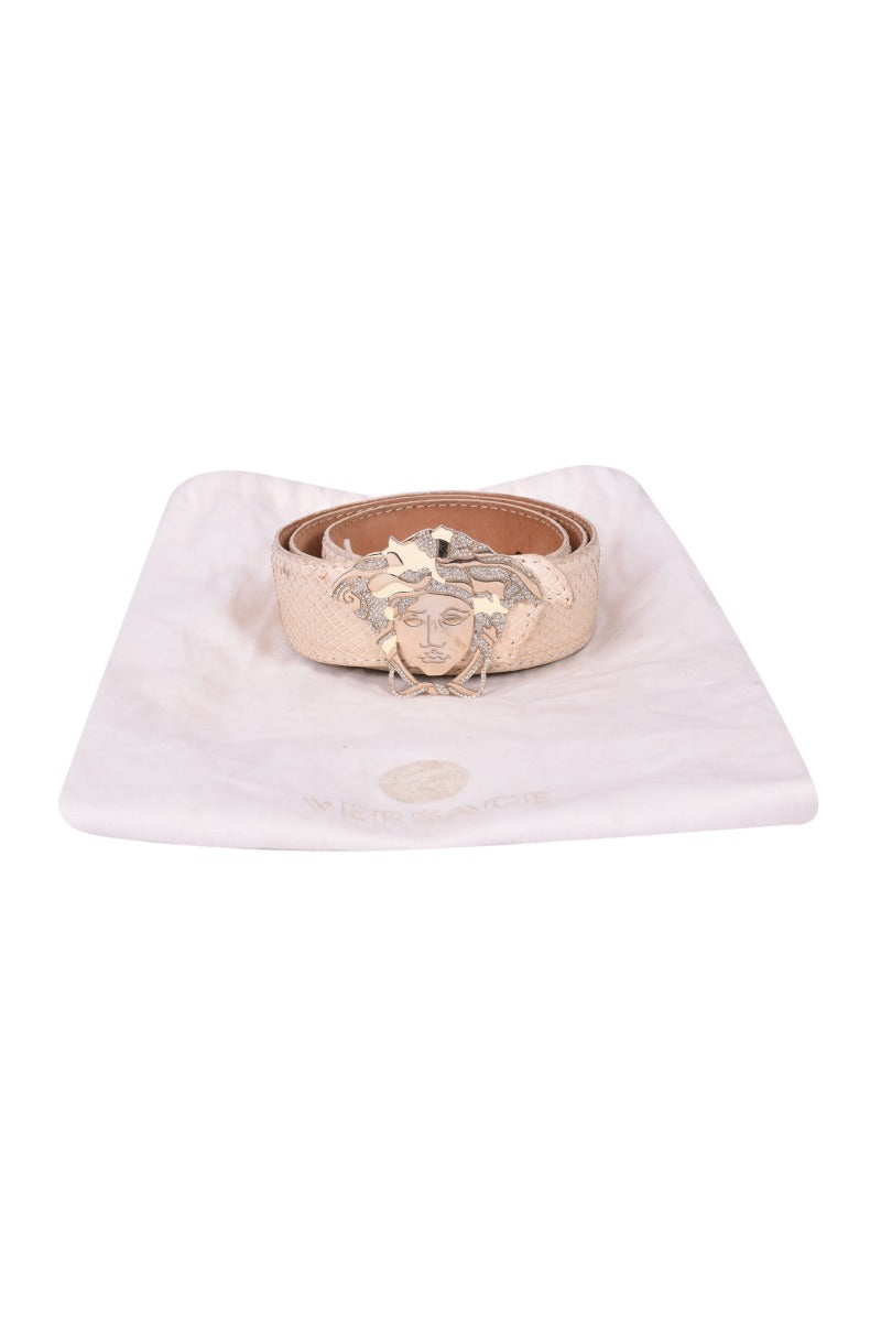 Versace Medusa Swarovski Snakeskin Belt Comes in this stunning Off White color. It falls under our Good Condition Category. No visible wear and tear or fading can be seen
