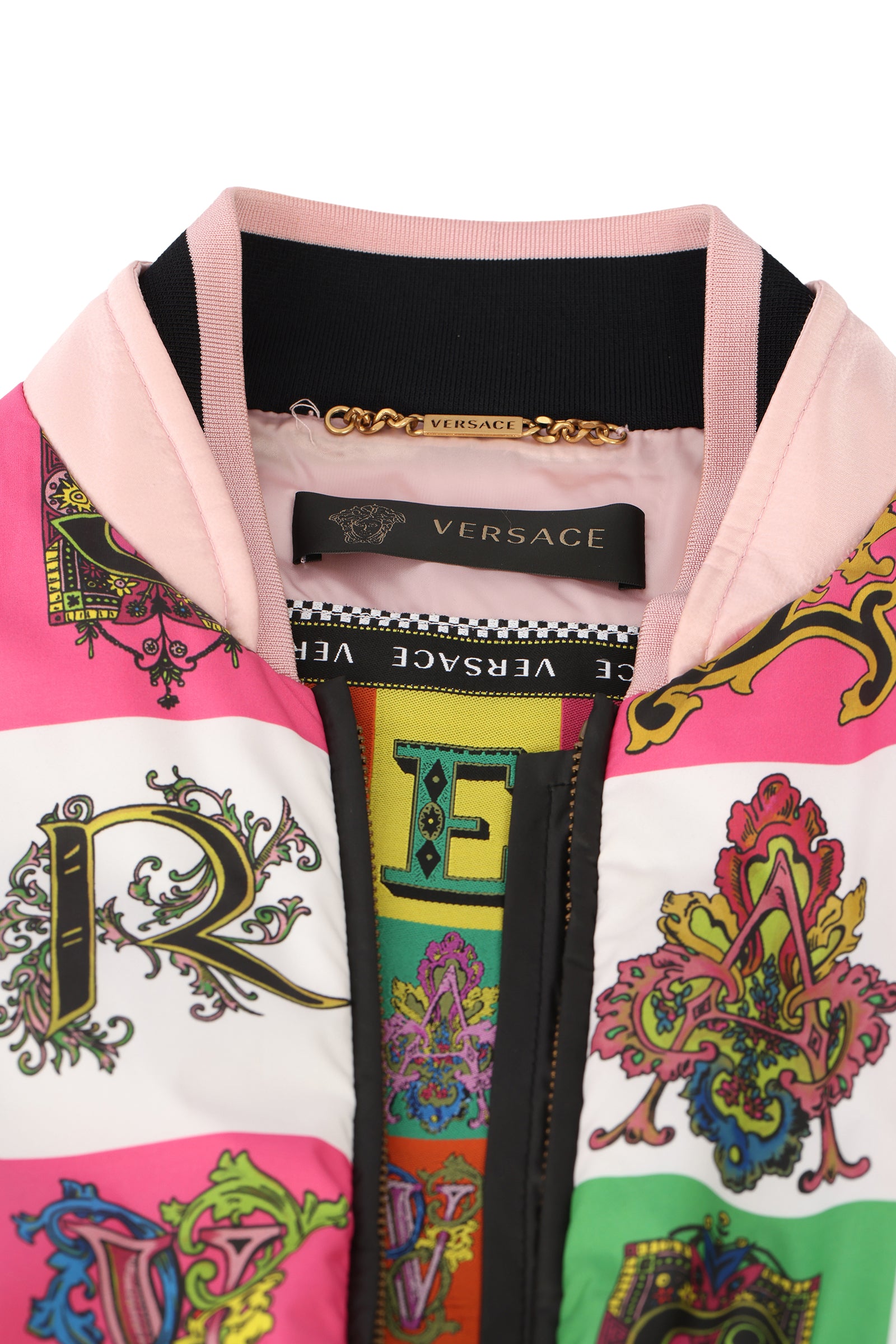 VERSACE SIZE MEDIUM ALPHABET PRINT BOMBER JACKET comes in this Stunning White color. It falls under our Pristine Condition Category. No visible wear and tear or fading can be seen.