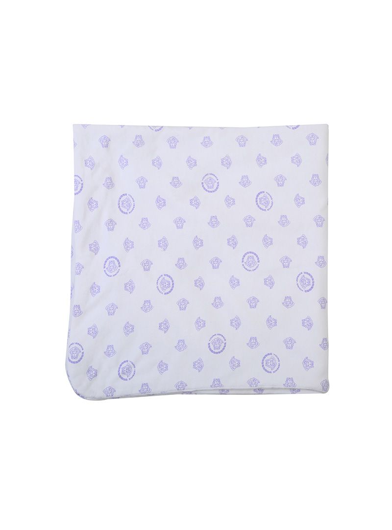 YOUNG VERSACE'S CLASSIC BABY BLANKET WITH ALL OVER LILAC MEDUSA MONOGRAM PRINT. MADE FROM SOFT COTTON JERSEY FABRIC KEEPING IN MIND YOUR BABY'S DELICATE SKIN. REVERSIBLE CAN BE USED FROM BOTH SIDES.2-3 PEN MARKS ON THE BLANKET. NO WEAR & TEAR.